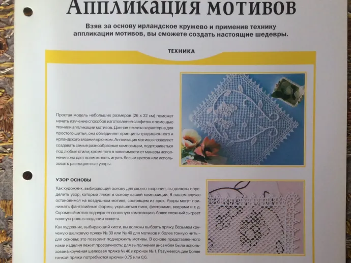 Снова Deagostini.На этот раз хочу с вами поделится одной замечательной идеей: аппликация мотивов. За снову берётся ирландское кружево, но используемая техника - аппликация.На мой взгляд , таким образом можно создавать изделия в технике ирландского кружева несколько проще, чем соединяя отдельные элементы с помощью сеточки. Здесь сначала вяжется сеточка из арок, а уже на неё в технике аппликации пришиваются с изнанки элементы будущей красоты. Это кружево получается более объемным и выпуклым. Эта техника годится не только для вязания салфеток, но и любых изделий: летних топиков, кардиганов и т.д.Я думаю, вы оцените эту технику, как более простую в исполнении, но позволяющую создавать шедевры.
