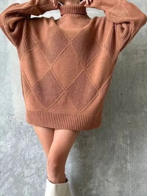 Свитер-оверсайз с очень крупными ромбами. Часть из них заполнена полупатентной резинкой, а другая половина - лицевой гладью. Модель продается в разных цветах. Мне понравились два - в цвете "молочный шоколад" и айвори.