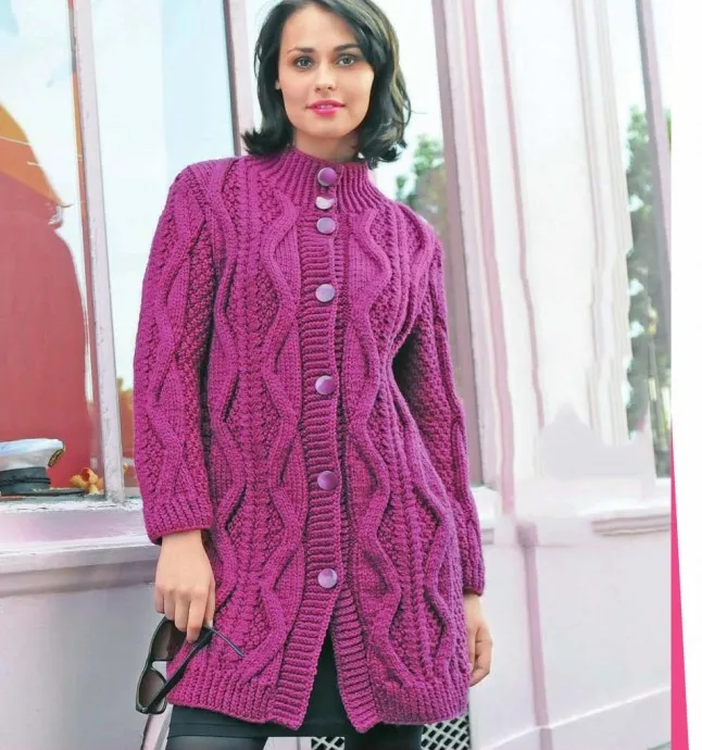 Вам потребуется: 23/24/26/28/31 моток малиново-сиреневой (Baie 1188) пряжи Bouton D’ОrLaika (100% шерсти, 50 м/50 г); спицы № 6 и № 7; 1 вспом. спица; 7 пуговиц.