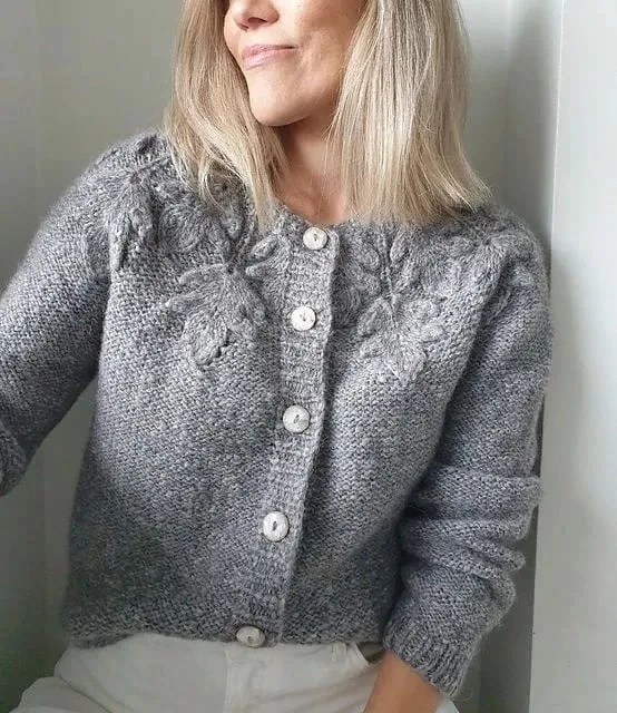 Жакет с круглой кокеткой узором " дубовые листья", вяжем спицами