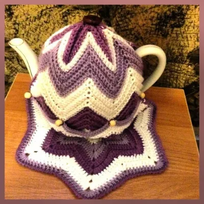 Вот такую грелочку для заварного чайника вязали мы с девочками на одном из форумов.И в дополнение к нему салфеточка.Получился вот такой комплект.Связано крючком из акрила и полушерсти из остатков.
