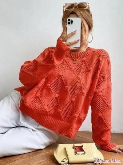 Яркий оранжевый свитер с крупным ажурным узором