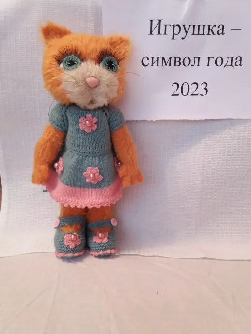 Добрый день! Решили с Муркой поучаствовать в конкурсе. Тем более, что среди моих вязаных игрушек кошки нет. Связана она из х/б пряжи «Травка» Комтекс по кругу лицевой гладью на 4-х спицах № 3,0. Ни одного шовчика в детальках нет, даже на пальчиках, которые связаны спицами №1,0, а затем соединены с помощью спиц №2,5. После вязания ладошки перешла на №3,0. На ножках вывязана пяточка, чтобы ступня сгибалась. Глазки связаны крючком №1,5 и приклеены на белый фетр, а затем посажены на мордочку с помощью клея. Реснички готовые, тоже приклеены. Хочу отметить, что на фото реснички другие, т.к. приклеивала их уже на готовую куклу и с ними получилось очень громоздко. Пришлось их отдирать и менять на более легкие. Розовый носик покупной на шайбочке. Утяжки на мордочке самые простые: для глазок (сзади со стороны шеи), для формирования щечек небольшая перетяжка вниз от носика. Пришита губка – простой овальчик, согнутый пополам. Ушки – это просто треугольнички. Усики из тонкой проволоки протянуты через петельки и завязаны узелком. Платье и туфельки связаны из остатков пряжи. Платье регланом сверху до талии, затем добавила для пышности 30 петель, внизу юбочки поменяла пряжу и обвязала крючком, чтобы край не заворачивался. Туфельки мне помог связать МК «Мир вязания с Кариной». Там очень подробно все показано. Для украшения связала цветочки, пришив бусинки в их середину. Сшила все детали и немного поработала щеткой-пуходеркой, чтобы придать пушистость. Вот и все!