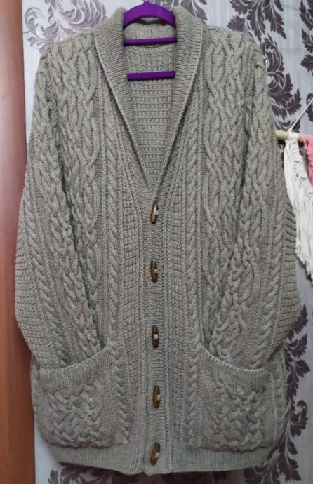 Давно ничего не выкладывала здесь, и вдруг захотелось) В конце прошлого года заказали мужской кардиган, и муж загорелся. Хочу, говорит, такой, чтобы длинный и тёплый. с карманами и аранами, только без капюшона. На 23 февраля не успела, сложный узор выбрала и тонкую нить. Пряжа бобинная меринос с кашемиром на шёлке, 700 метров в 100 граммах в три сложения, спицы №3. Недочёты свои вижу, но всё равно радость внутри от того, что я его закончила, и одной красивой мужской вещью в мире стало больше)