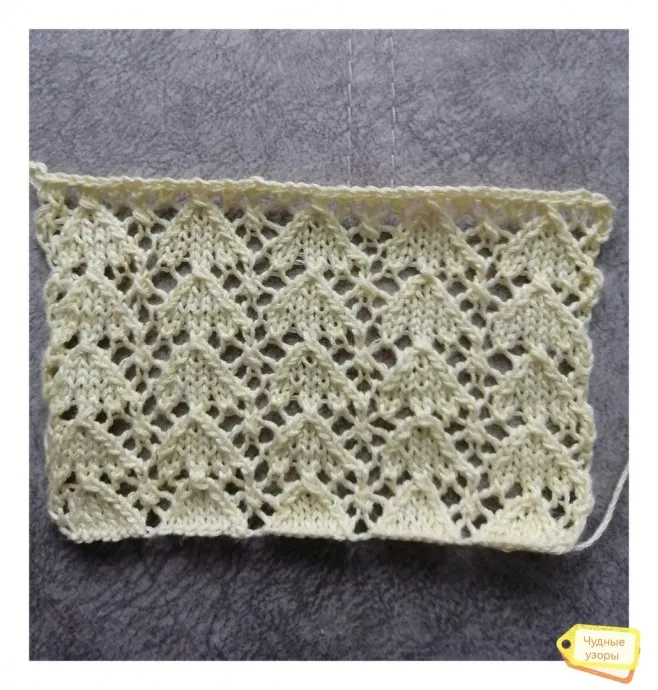 3-й ряд: 1 кромочная, *1 накид, 2 петли вместе лицевой с наклоном влево, 3 лицевых, 2 петли вместе лицевой с наклоном вправо, 1 накид, 1 лицевая* (повторять от *до*), 1 кромочная.