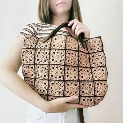 1) Вяжем 58 самых простых квадратов крючком по схеме (у меня рафия Ispie - 2 мотка, крючок 3,75 мм).