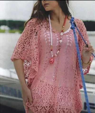 Выполнить плечевые швы, по краям переда и спинки набрать 98 петель и вязать ажурным узором.