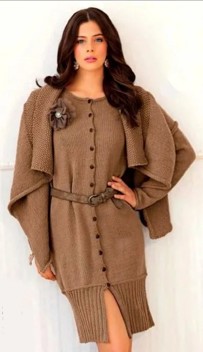 Комплект спицами: платье со сквозной застежкой и жакет, связанный поперёк "с углами"