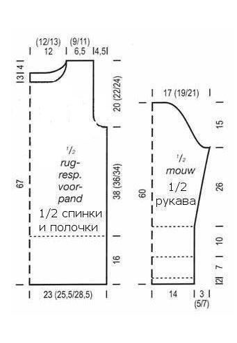 Полочка: Вязать, как спинку, но через 67 см от начала работы для горловины закрыть средние 24 (24/30) п., затем с каждой стороны от выреза закрыть в каждом 2-м р. 1 раз 5 п., 1 раз 4 п., 1 раз 3 п,, 3 раза по 2 п. и 2 раза по 1 п.