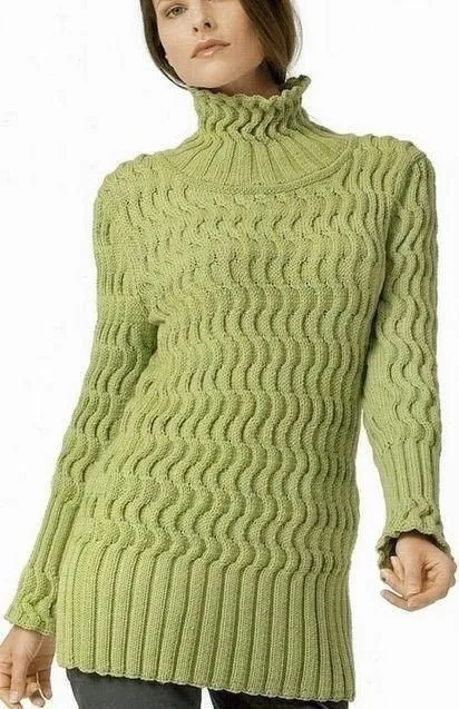 По горловине на круговые спицы набрать 138 (138/150) п. И отложить в сторону. На другие круговые спицы для бейки Головины набрать новые 138 (138/150) п. и вязать резинкой 3/3, начав с 3-х изн. и закончив 3-мя лиц. п. После 3-го р. вязать 19 р. осн. узором, затем опять резинкой 3/3. Через 15 см от начала работы вернуть петли, отложенные в сторону, и провязать по 2 п. вместе лиц., беря одну петлю с горловины и 1 петлю с бейки для горловины. Провязать 3 р. лиц. гладью. Затем пришить эти петли с изн. стороны, закрыв кромку горловины.