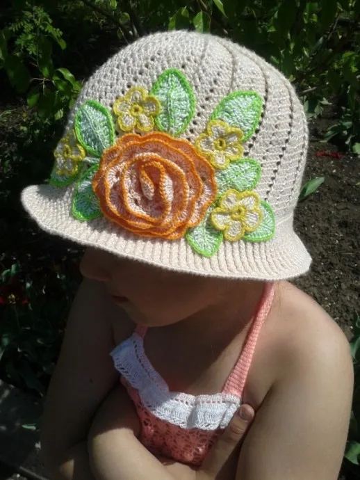 Сарафанчик тоже вязала ради интереса, а по итогу, дочь быстрее выросла, чем я довязала его))) Уж очень тоненькая ниточка, белые рюши - вообще связаны из катушечной швейной нитки )) Цветы и листики на панаме тоже из швейных ниток))