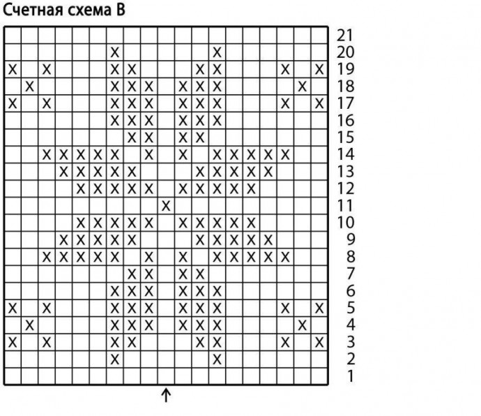 Вязать лицевой гладью согл. счетной схеме В в норвежской технике. Выполнить 1–21-й круговые ряды 1 раз.