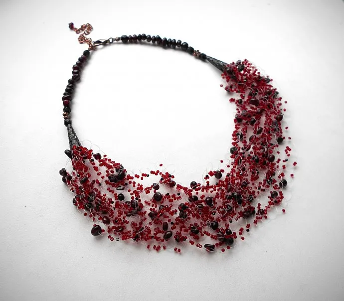 Помимо вязания у меня есть ещё одно увлечение. Выполняю бижутерию в различных техниках. Сегодня хочу представить ещё одну свою работу - Колье "Гранатовые Брызги". Прекрасное,воздушное колье из природного граната,чешского бисера и сверкающей чёрной шпинели! Цвет очень красивый.сочный.насыщенный,подходит различным типажам внешности! Классика - бордовое(красное,винный цвет) и чёрное - всегда в моде. Отдельные бусинки как будто парят в воздухе. Мелкие бусинки чёрной шпинели с огранкой так и искрят в электрическом и солнечном свете! Фурнитура под медь. Колье выполнено в технике вязание с бисером на леске.