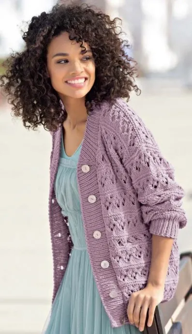 Вам потребуется: пряжа (100% хлопка; 75 м/50 г) - 700 (800) г сиреневой; спицы № 5; круговые спицы № 4.5; 6 сиреневых пуговиц (размер 23).
