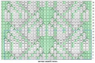 Серые клетки = нет петли. Основной узор топа – английская резинка. Зеленым цветом справа отмечена центральная петля. Оранжевый цвет - это обычная резинка 1х1, ею связаны разрезы по бокам, а потом она ...