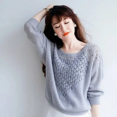 Цельный рукавчик а-ля «летучая мышь», круглый вырез и оригинальный ажурный узор, идущий буквой «V» по центру джемпера.