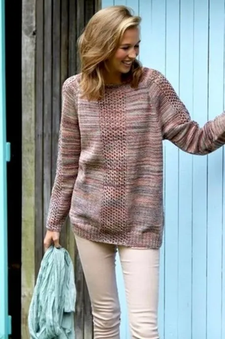 Сборка: выполнить швы реглана. Затем выполнить швы рукавов и боковые швы. На короткие круговые спицы набрать по вырезу горловины 144/144/152/164/164 п. и замкнуть работу в круг. Связать 10 круговых р. узором для планки, начиная с 2 лиц. и заканчивая 2 изн. Затем все петли закрыть. Все нити заправить иглой для шерсти.