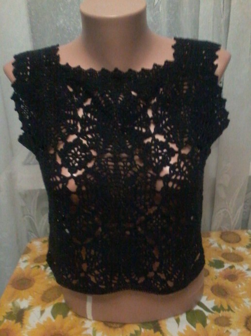 Я бы не стала нагромождать узоры (здесь уже два вида мотивов и обвязка), а продолжила бы этими же мотивами, чтобы получилось маленькое черное платье — футляр