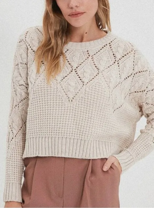 Джемпер с ажурным узором из ромбов с косами в верхней части переда и рукавов