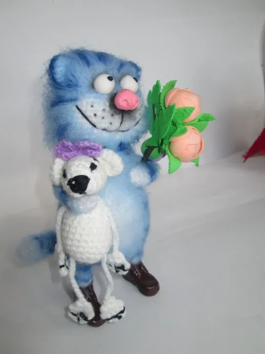 Связан кот крючком из мохера, внутри каркас из флористической проволоки.