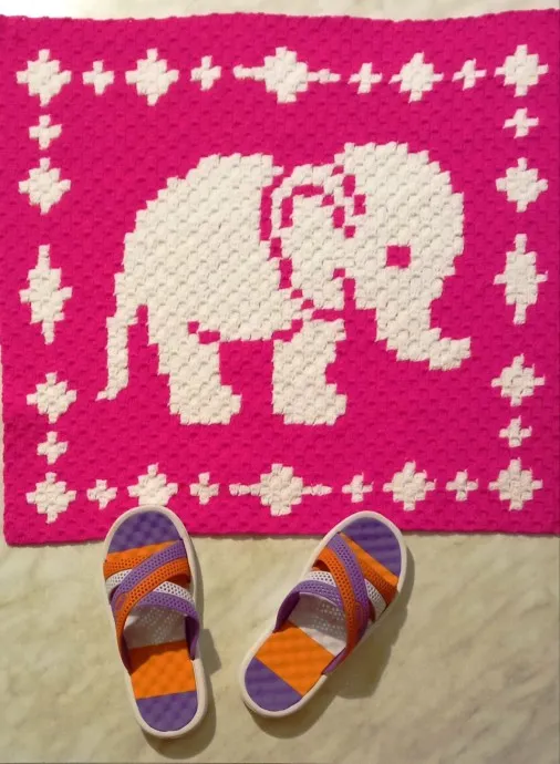И так — нитки высокообъемный акрил Детская новинка фирмы пехорка, 200м/50г, цвет слоненка и геометрических узоров по краям белый: лот 61, а само поле — малиновый мус, лот 378. Крючок №3. Всего ушло 200г. Размер 59 на 50 пикселей, 60 на 56см, как раз что надо было. Получилось ярко, слоненок узнаваем, я довольна. Квадратики могут быть разные. Хочется попробовать другие, но начались садово-огородные работы… Придется отложить до зимы.