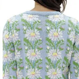 Основная вязка – лицевая гладь узором «ромашки» по счетной схеме. Плотность вязания: 30 п. и 31 р. = 10х10 см спицами 3.25 мм.