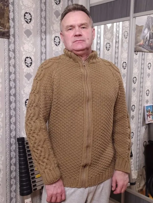 Я это сделала! Муж запросил на будущую зиму жакет на молнии, из толстых ниток, чтоб такой основательный. Естественно, перерыв весь интернет, не нашли того, что хочется - всегда ведь нужно что-то эдакое, иди туда не знаю куда. К счастью, есть на нашем сайте рукодельница, которая показала мужской жакет как раз из тех ниток, которые выбрали и мы- из Зимней премьеры от Пехорки. Так он и получился, не точная копия, но по мотивам подсмотренного. Муж доволен)