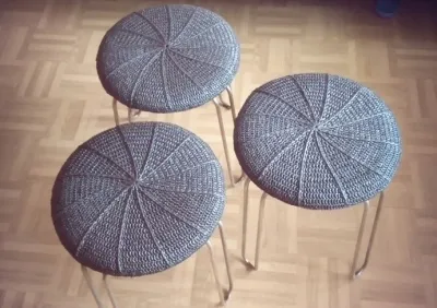 Давненько не заходила на страничку)) Спешу с вами поделиться своим вариантом преображения домашних табуреточек) Табурет обычный, дешовенький, обтянут дермантином.. и вот, пришло время, начал лопаться, ну и сынишка давай помогать..отрывать кусочки)) Пришлось спасать)) связала 4 "блинчика" (бортик-последние 4 ряда вязала без прибавок), по краю вдела обычную резинку, сшила и готово!! Я вязала из полиэтиленовой ленты, можно конечно и из пряжи и т.п. По моему получилось очень даже симпатично :-)