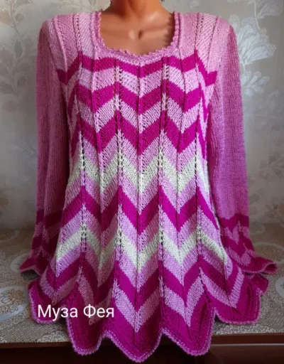 Связала пуловер в стиле Миссони. Пряжа довольно толстенькая и увесистая, поэтому рукава выше манжет связала из более тонкой розовой вискозы.