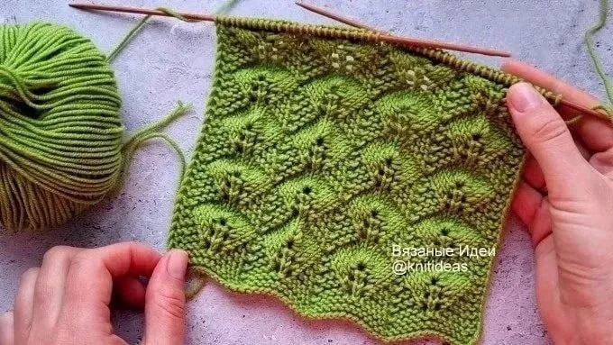 3 ряд: кром, 2 вм. изн, 3 изн, 1, лиц, накид, 1 лиц, накид, 1 лиц, 3 изн, 3 вм. изн, 3 изн, 1 лиц, накид, 1 лиц, накид, 1 лиц, 3 изн, 2 вм. изн, кром.