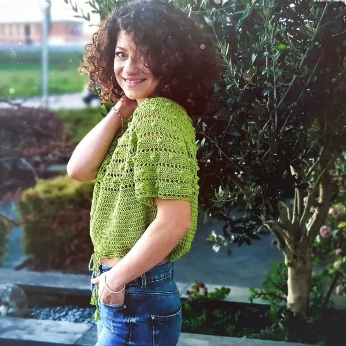 Джемпер с круглой кокеткой крючком узором с шишечками