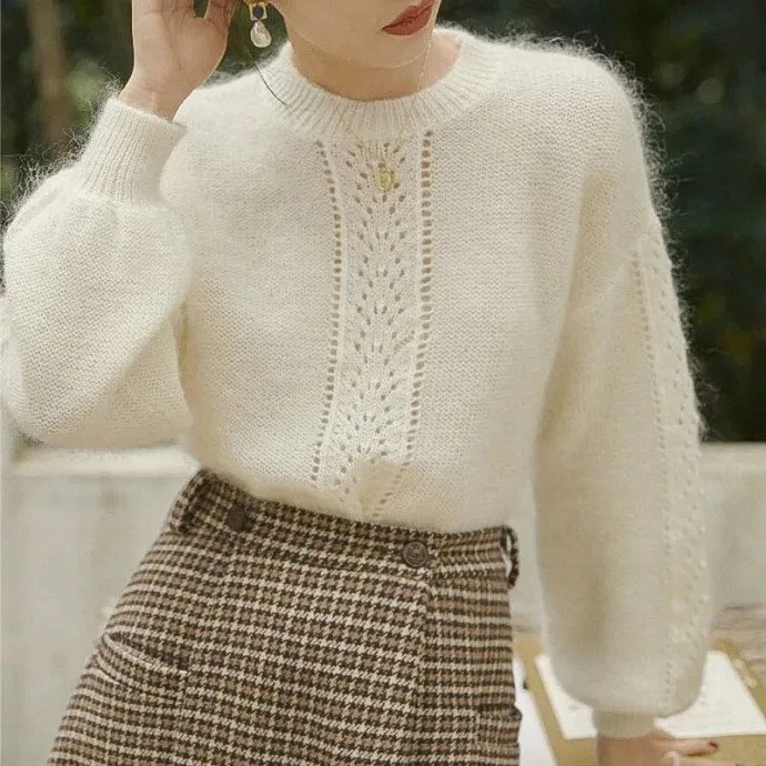 Спицами: джемпер с ажурной отделочной полосой по центру переда и рукавов