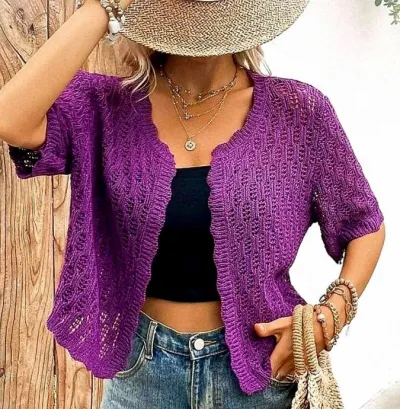 Жакет без застежки. Горловина, планки и низ жакета и рукавов - резинка 1х1 с фестонами.