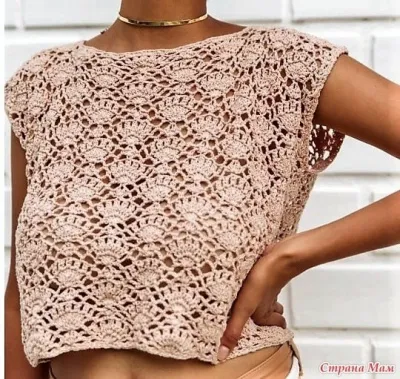 И ещё. Узор, конечно, хоть и простенький, но приятный, а, вот, пряжа… Пряжа мне тоже не очень нравится: Какая-то она грубоватая, что ли… топ смотрится помятым...