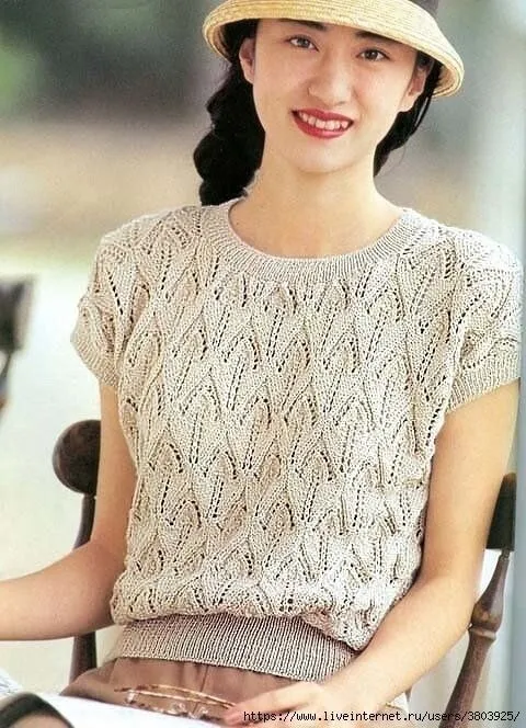 Ажурный джемпер с коротким рукавом связан потрясающим узором "Трилистник"