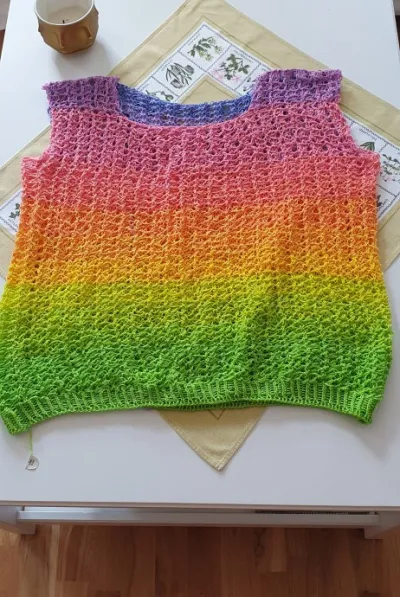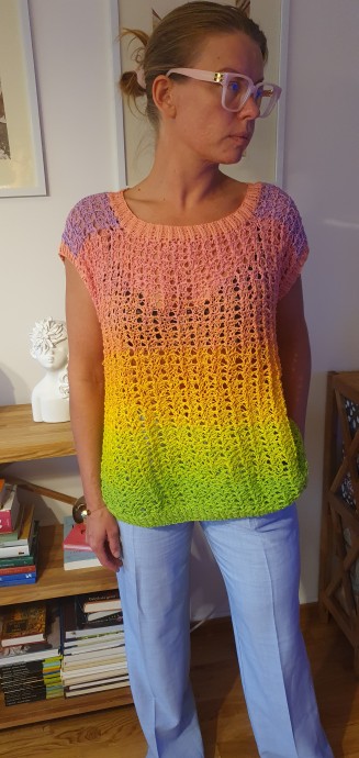 Несколько попыток обвязки горловины и проймы закончились классикой - резинкой 2×2 со скрещеной лицевой петлёй. Получился невесомым и лёгким.