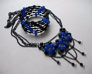 Одна из моих работ на заказ. Колье и мемори-браслет " Королева Ночи". Шикарный,необычный,выразительный комплект! В работе использованы гранёные ярко-синие бусины-рондели из тонированного жадеита и чешские гранёные чёрные бусины 2-х размеров. Также использована фурнитура 2-х оттенков - чёрного цвета и цвета воронёной стали,что делает комплект ещё интереснее,засчёт создания неповторимой фактуры при помощи цвета и разных размеров цепочек,использованных в работе.Браслет выполнен на проволоке с памятью,хорошо держит форму,носить такой очень удобно,смотрится интересно. Основной центральный элемент колье из бусин выполнен в одной из техник кольчужного плетения. Такой необычный комплект поможет создать яркий,запоминающийся образ!