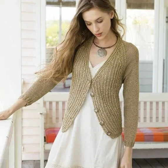 В этой модели вязаного жакета нет ничего лишнего, все просто, естественно, красиво. Плавные линии рельефного патентного узора подчеркивают убавления по вырезу горловины и скос плеч.