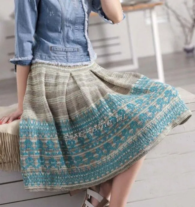 Нитью секционного крашения набрать 420 (440-460-480) п. и для нижней планки вязать по кругу 1,5 см - 5 р. платочной вязкой, при этом 1-й р. провязать изнаночными. Линии боковых швов отметить маркерами, прикрепив их в начале ряда и после половины от общего числа петель - 210 (220-230-240) п. Далее выполнить 60 р. жаккардовым узором. После этого работу продолжить лицевой гладью нитью секционного крашения.