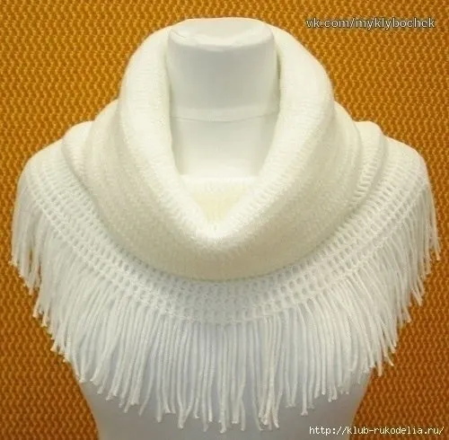Как видно на фото, снyд связан крючком, самым простым узором. По краю изделия закреплена бахрома. Все изящество этого шарфа в его простоте, поэтомy здесь не нужны никакие дополнительные узоры...