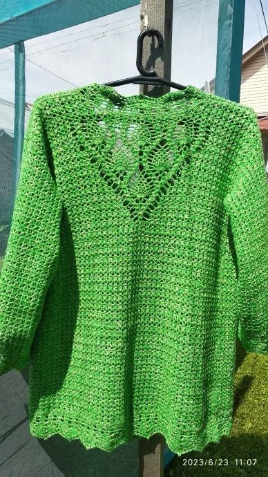 Добрый день. Я уже советовалась с мастерицами насчёт этой пряжи. Начинала вязать спицами, но изделие сильно косило. Прислушалась к советам и начала вязать крючком. Ушло около 5 мотков на размер 48-50 размер. Вот что получилось. Чтобы не было совсем скучно, на спинке добавила ажурный элемент. После стирки пряжа практически не села и не вытянулась. Стирала в чуть теплой воде