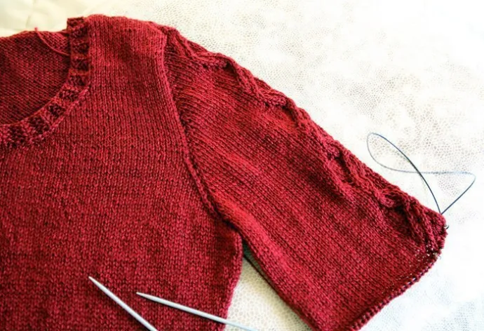 Отмечаем центральную петлю, ту что у плечевого шва. (У меня вы увидите еще 2 маркера, это потому что по центру рукава шел узор в 9 петель, маркеры для него, но по ним вы сможете легко ориентироваться, как прибавлялись мои ряды.)