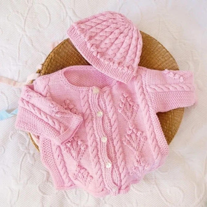 Узоры из «кос» и «шишечек» в фольклорном стиле придадут жакетику неповторимое очарование. А шапочка с косами дополнит образ.
