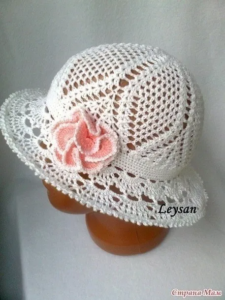 и окончательный вариант, пряжа Ажурная (Пехорка)100%хлопок,50г/280м, белая (меньше одного мотка) и чуть-чуть светло-розовой, крючок 1/0 и 0,6мм - самый первый мой опыт вязания шляпок.