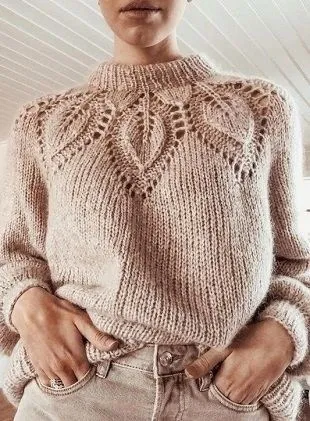 Украшение этого джемпера стала ажурная кокетка, связанная по кругу. Для вязания джемпера рекомендуем взять спицы номер 3 или номер 4.