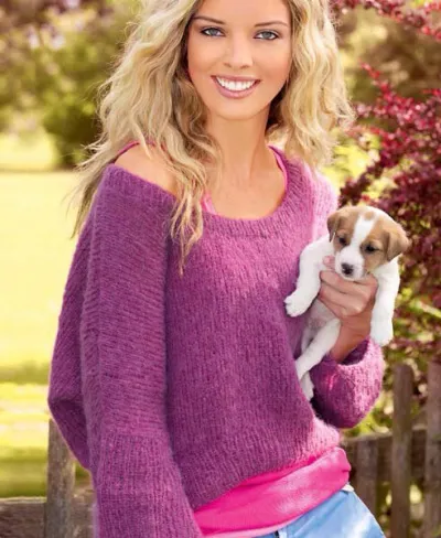 Модель также может выполнена из пряжи другого цвета (например, бордо, зеленая, синяя и т.д.) и состава (для нее хорошо подойдет также пряжа из супер-кид мохера и шелка, 175 м /25 г).