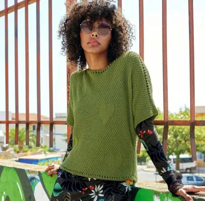 Джемпер с коротким цельнокроенным рукавом спицами узором с сердечками