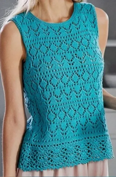 Нежный, бирюзовый топ для женщин к лету связан ажурным узором спицами и по низу изделия связана красивая кайма крючком.