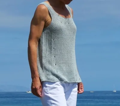 Присмотритесь к модели: она не так проста, как показалась сначала. Майка связана сверху вниз в технике реглан. Отсюда и такие интересные лямки, и узор из наклонных рядов, словно рамкой, обрамляющий лицевую гладь переда и спинки!