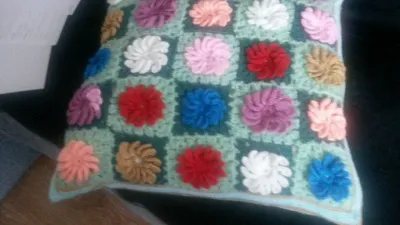 Да в доме находились разные клубочки все думала куда их пристроить, в интернете нашла мотив квадрат с цветком и решила што-нибудь связать, получилась наволочка на подушку и клубочков не стало.